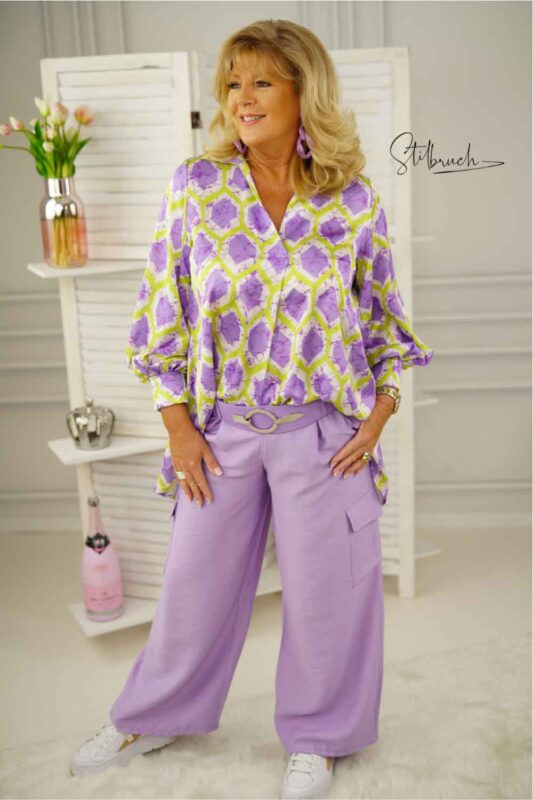 Für den zarteren Fliederton gelten ähnliche Stylingregeln. Besonders elegant wirken helle Naturtöne und natürlich Weiß zu Flieder. Aber auch zu hellen Jeans kannst du Flieder wunderbar tragen.