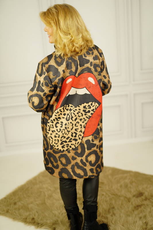 ausgefallener Herbstmantel im Leo-Druck mit einer coolen Rolling-Stones-Zunge vorne sowie hinten auf dem Rücken.