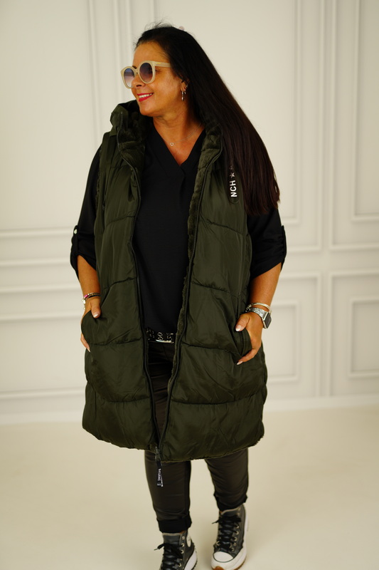 wunderschöne & wasserabweisende Wendeweste. Die Weste hat seitlichen Eingriff-Taschen innen & außen, sowie eine Kapuze mit Bändern.
